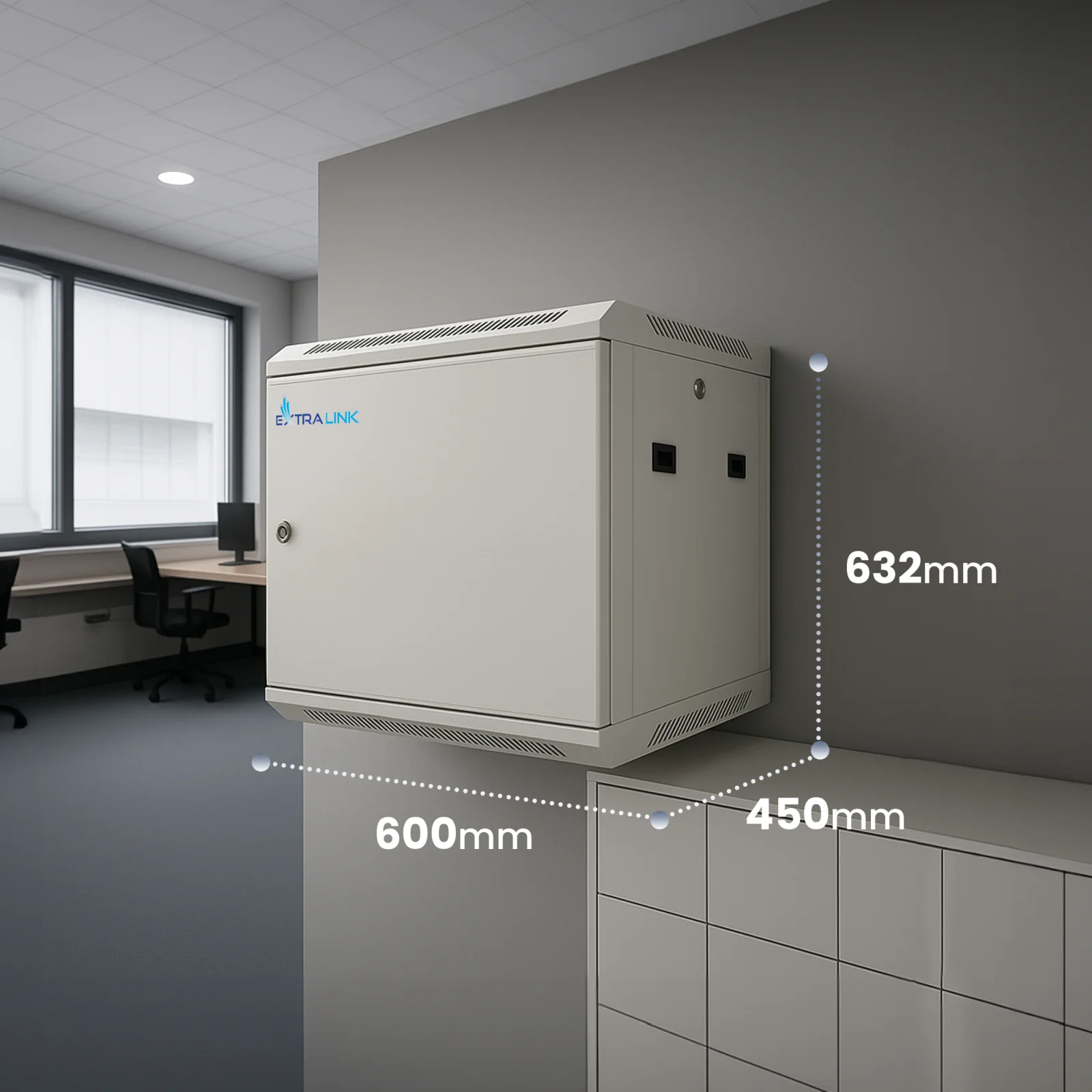 The Extralink rack cabinet is designed for wall mounting in offices, network server rooms and CCTV control rooms. The external walls are made of cold rolled steel. The door can be opened to the left or right side.