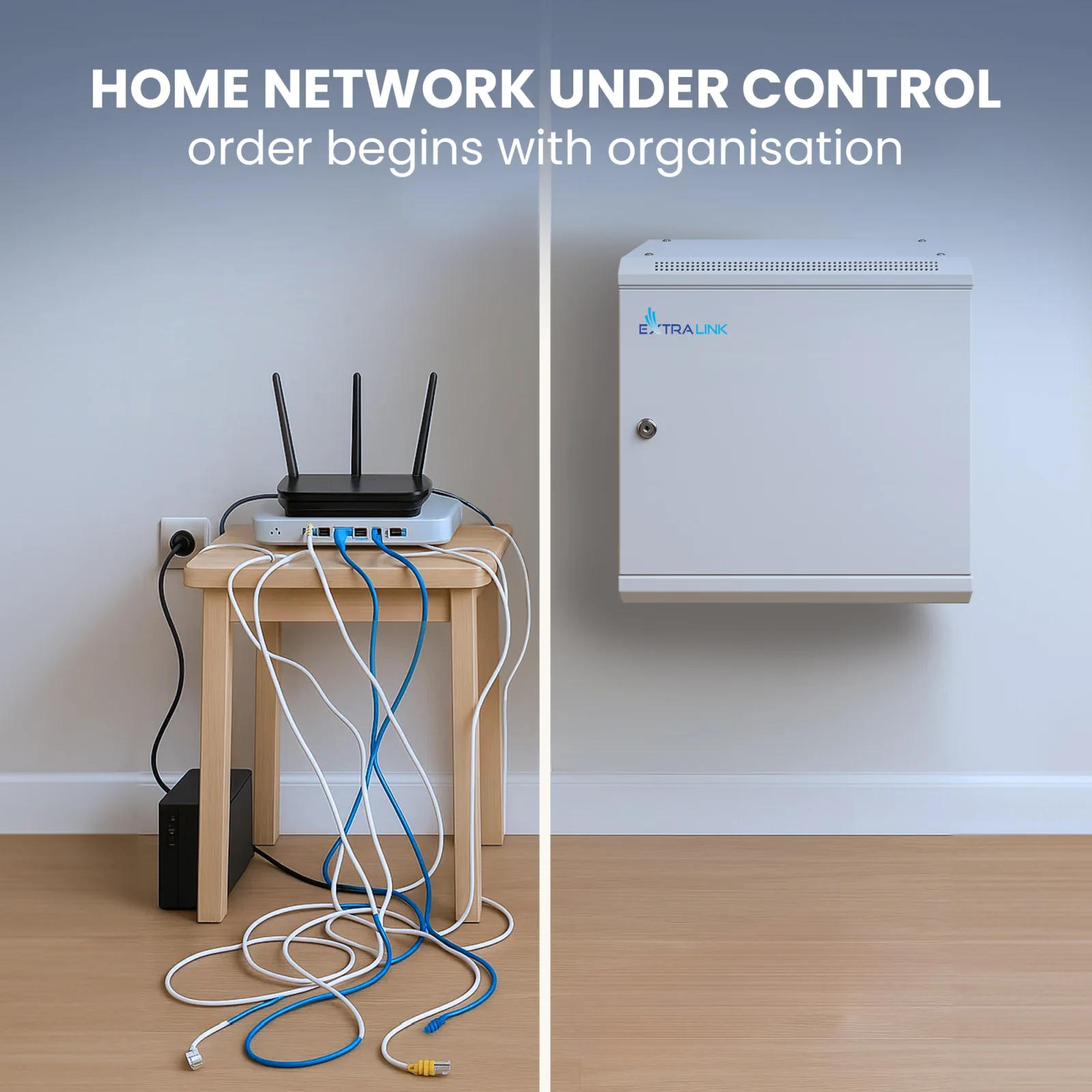 Extralink skápar eru hannaðir til að festast á vegg í skrifstofum, tölvuverum, fyrir myndavélakerfi of fleira. Ytra byrði er búið til úr kald pressuðu stál plötum. Hurðin er með hertu gleri og hægt að opna bæði frá vinstri eða hægri. Settið inniheldur sett af lyklum og skrúfur til að festa tæki í rekkann.