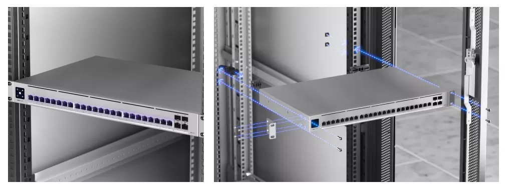 The USW-Pro-HD-24-PoE incorporates Ubiquiti’s Etherlighting™ technology, which illuminates the ports to indicate port location, speed/link status, and native VLAN/network. This visual feedback simplifies network management and troubleshooting by providing clear, real-time status information. The 1.3″ touchscreen LCD provides real-time system status updates, enhancing user experience and simplifying network management. The switch has an SGCC steel enclosure measuring 442.4 x 400 x 44 mm and weighing 6.4 kg, making it suitable for both rack mount and standalone deployment.
