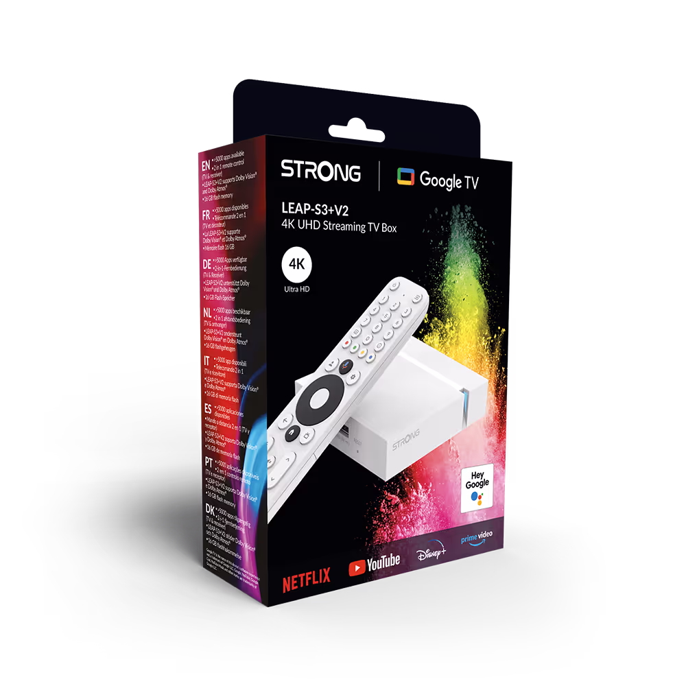 Þetta litla, netta snjall Google TV er rétti kosturinn fyrir sjónvarpið þitt. Tengdu STRONG LEAP-S3+V2 til að uppfæra sjónvarpið þitt í snjallsjónvarp með beinum aðgangi að Google Play Store! Þessi Google TV er búinn Android 11 og býður þér upp á frábæra notendaupplifun. Sérstaða nýju fjarstýringarinnar eru talnahnappar frá 0-9. Það gerir notendum sem vilja nota og horfa á IPTV forrit til að velja sjónvarpsrásir með þessum hnöppum.