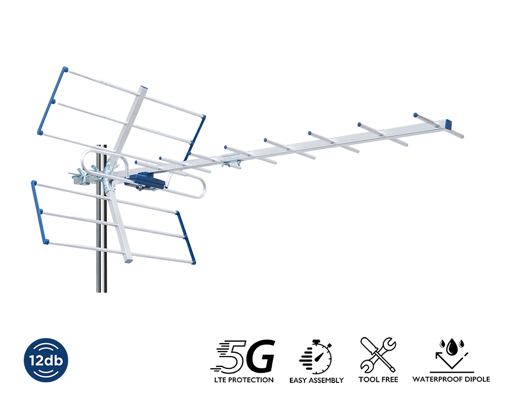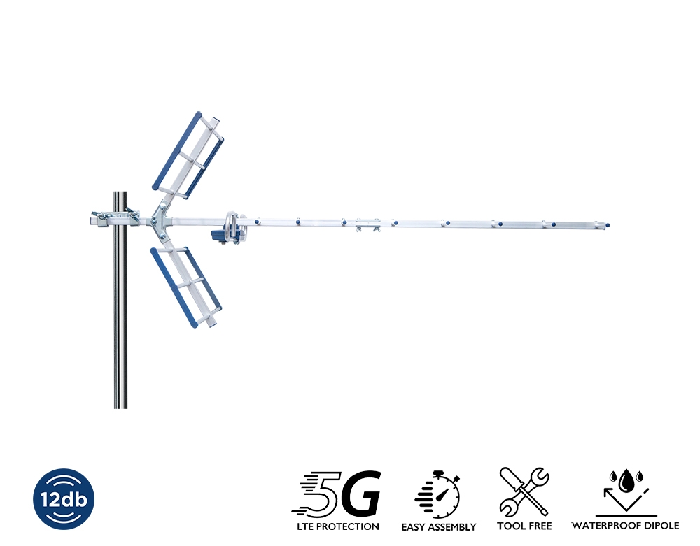 The EDISION antenna YAGI 12db 5G 21-48, is for receiving Digital Terrestrial TV channels 21 to 48 UHF. It provides gain of 12db and at the same time, cutting interference from 4G & 5G LTE frequencies. It features high-quality aluminum construction and quality synthetic materials, along with butterfly-type ‘nuts’ for easy and safe assembly. Combined with its discreet aesthetics, it is an ideal choice for any installation at a point that has easy reception of Digital Terrestrial signal.